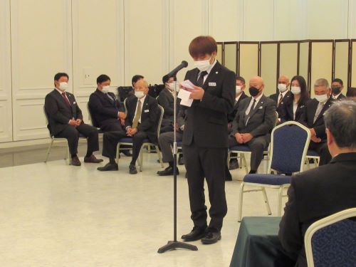 新入社員の泥濘さんより、「社会人としての自覚を持ち、一つ一つの仕事に責任と情熱をもって励んでいきます。」と決意の言葉が述べられ、会場は拍手に包まれました。