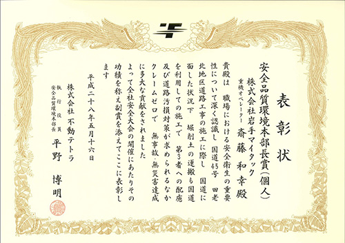 ㈱不動テトラ様の平成27年度「安全環境本部長賞」に選出され、