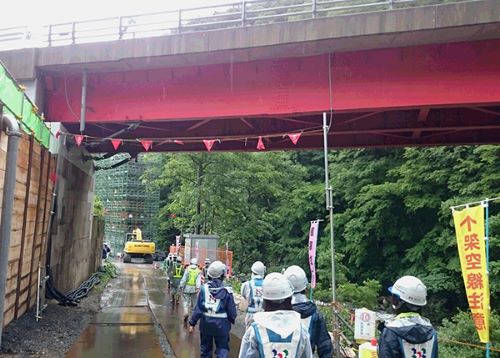 当日は雨で、作業をしている人も少数でしたが、現場を歩いていると架空線の切断予防のため予防線を張っていて、事故につながらないような安全への配慮が多く確認できました。