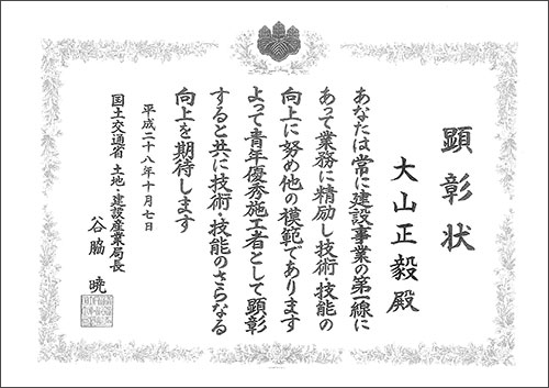 三陸事業所 大山正毅事業所長が建設ジュニアマスターを受賞いたしました。