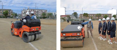 今回は、バックホウ1台(0.25)とローラー1台(3.5t)を使用し、同乗して実際に触れてもらうという内容です。