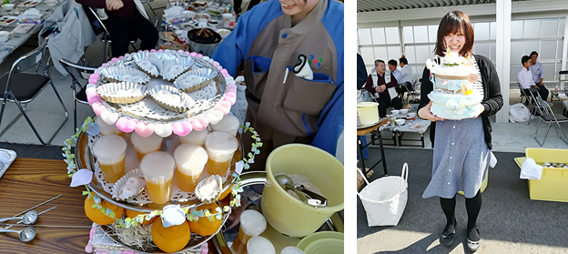 みなさんが毎年楽しみにしているデザートですが、今年も会心の出来でした。川端顧問から送っていただいた夏みかんを使ったゼリーなどがふるまわれました。おいしく見た目にも楽しいデザートでした。また、今年の6月に出産の予定を控えている本社従業員の久保田さんへ安産になるように願いを込めたプレゼントが送られました。