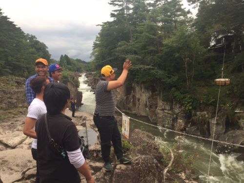 午後は厳美渓へ行き、名物・かっこう団子のやり取りに挑戦♪